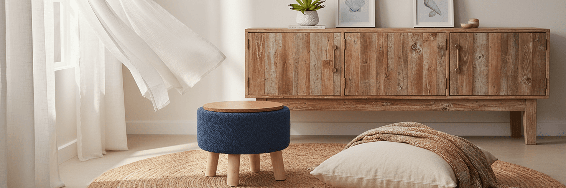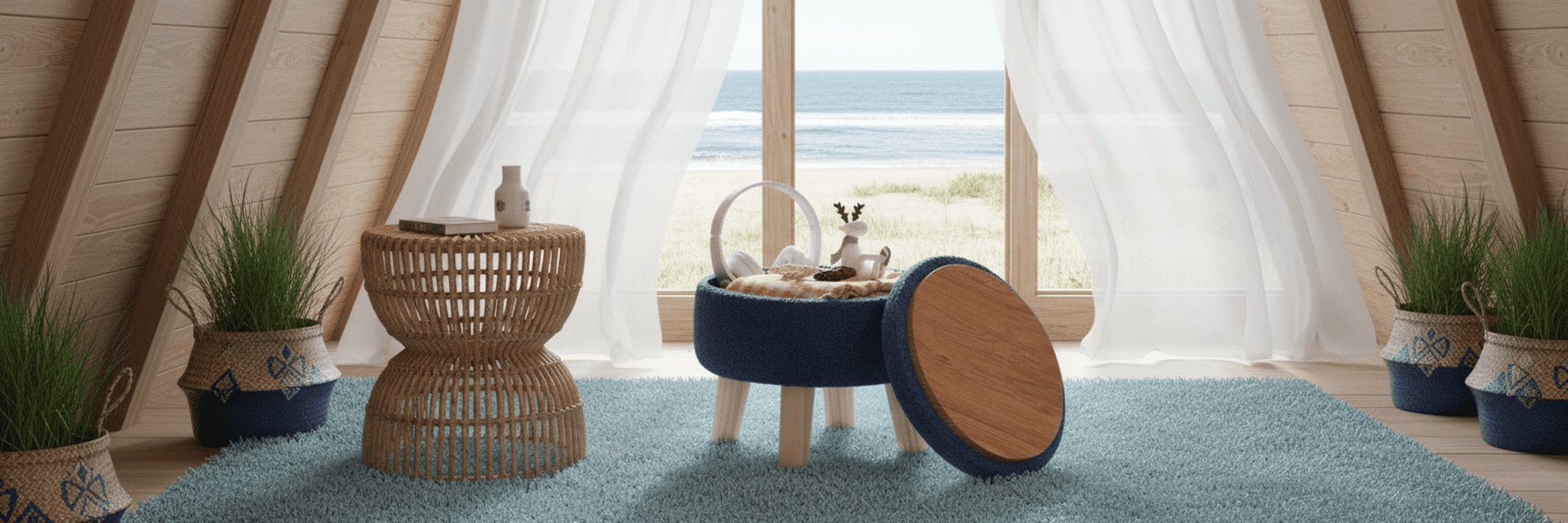 Light, airy, and relaxed coastal style interior space with neutral, ocean inspired color tones, natural materials, and abundant natural light.